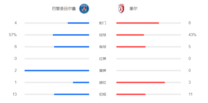上半场比赛结束,巴黎2-0暂时领先里尔。