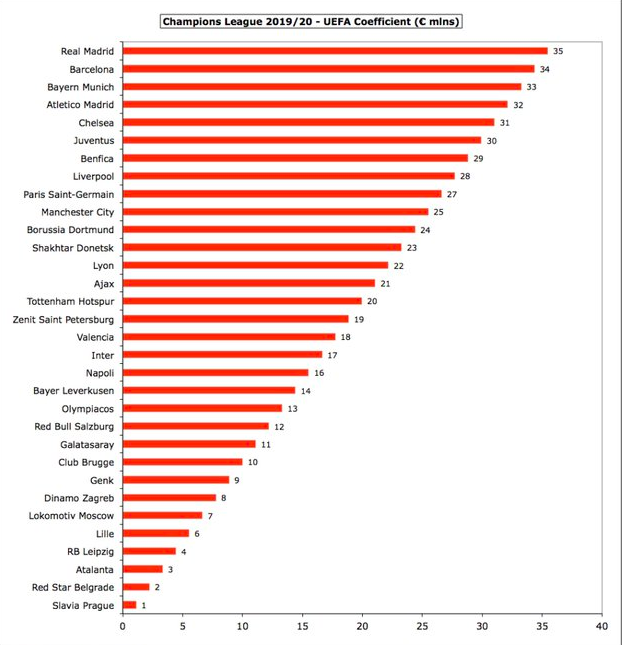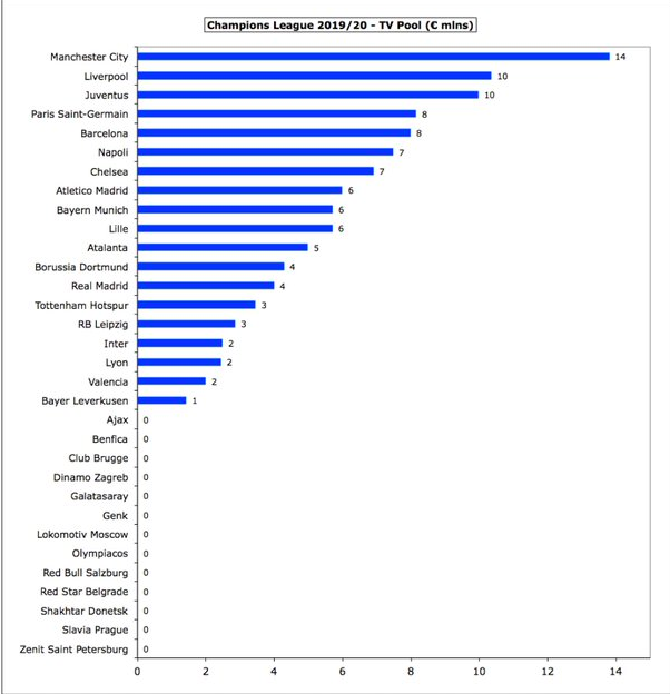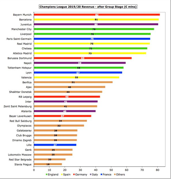 2019/20赛季欧冠小组赛阶段已经结束。一家名为Swiss Ramble的瑞士媒体盘点了32强在小组赛阶段从欧冠这项赛事中所获得的奖金 。其中 ,拜仁获得8200万欧元位居第一,巴萨、尤文紧分列二 、三位。