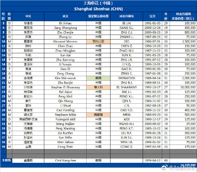 3-毕津浩 、4-蒋圣龙 、5-朱辰杰 、8-张璐、10-莫雷诺、12-陈钊 、13-赵明剑、14-孙凯、15-朱建荣 、16-李运秋 、18-高迪 、19-曾诚 、20-金信煜、21-朱宝杰、22-沙拉维 、23-柏佳骏、25-彭欣力 、26-秦升、27-李帅 、28-曹赟定 、30-姆比亚 、32-艾迪-弗朗西斯、33-汪海健 、35-冯潇霆、36-刘若钒 、37-孙世林、38-温 家 宝 、39-丛震
